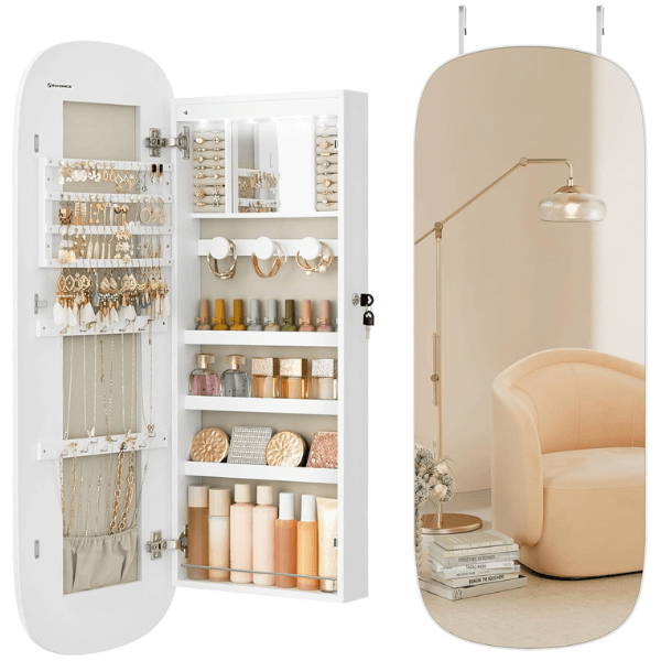 Mantém todas as tuas joias organizadas, protegidas e sempre à mão. Este armário de joias com espelho e luz LED combina armazenamento inteligente, design moderno e funcionalidade diária.