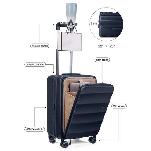 As rodas multidirecionais permitem deslocação fluida em qualquer superfície, reduzindo o esforço mesmo quando a mala está cheia.