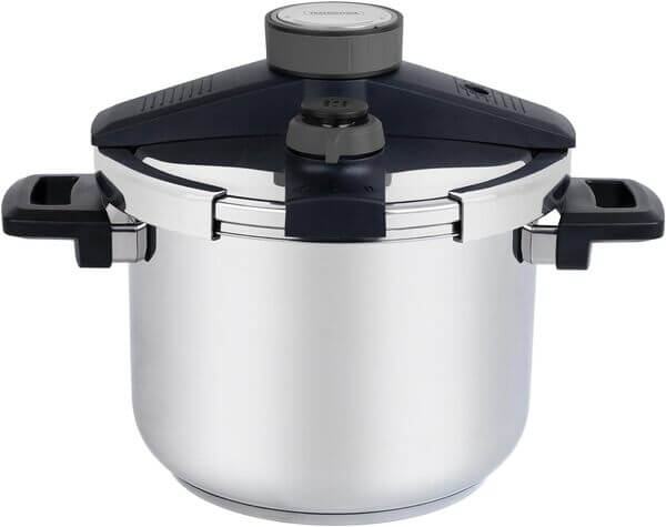 Cozinhe refeições mais rápidas e saborosas com uma panela de pressão de 6 litros, feita em aço inox com dispositivos de segurança integrados para uso diário.